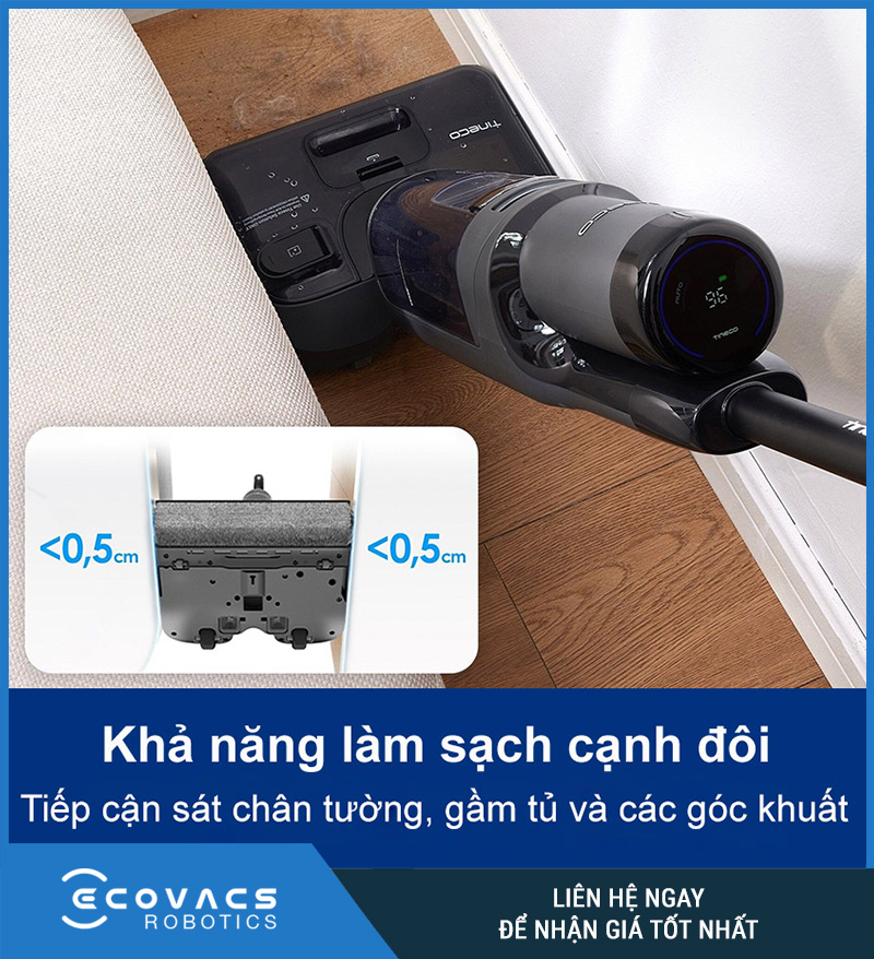 Nhờ hệ thống chổi và đầu hút được thiết kế sát mép chỉ từ 1cm, máy dễ dàng tiếp cận các khu vực mép tường, chân nội thất, góc nhà – nơi bụi bẩn thường tích tụ. Giờ đây, bạn không cần dùng chổi thủ công hay khom lưng lau lại sau khi dùng máy, tiết kiệm đáng kể thời gian và công sức.