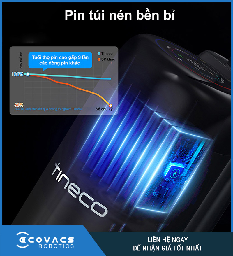 Tineco S6 Stretch Extreme sử dụng pin mềm dạng túi (soft-pack battery) – một công nghệ tiên tiến giúp tăng hiệu suất cấp điện và tuổi thọ so với pin truyền thống. Máy có thể hoạt động liên tục tối đa 40 phút chỉ sau một lần sạc đầy, đáp ứng nhu cầu làm sạch cả căn hộ 70–100m² mà không cần sạc giữa chừng.