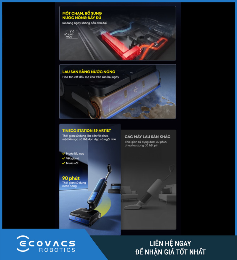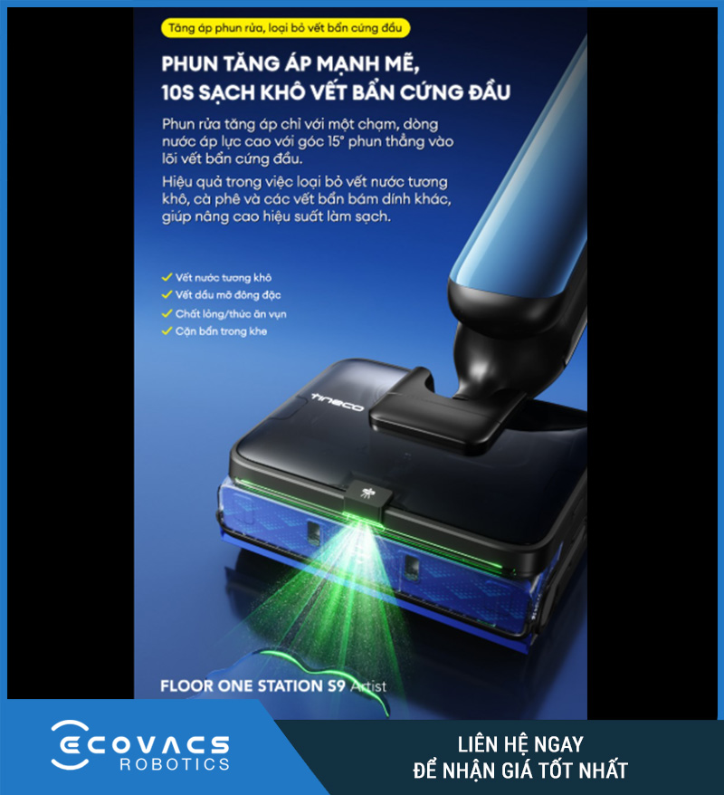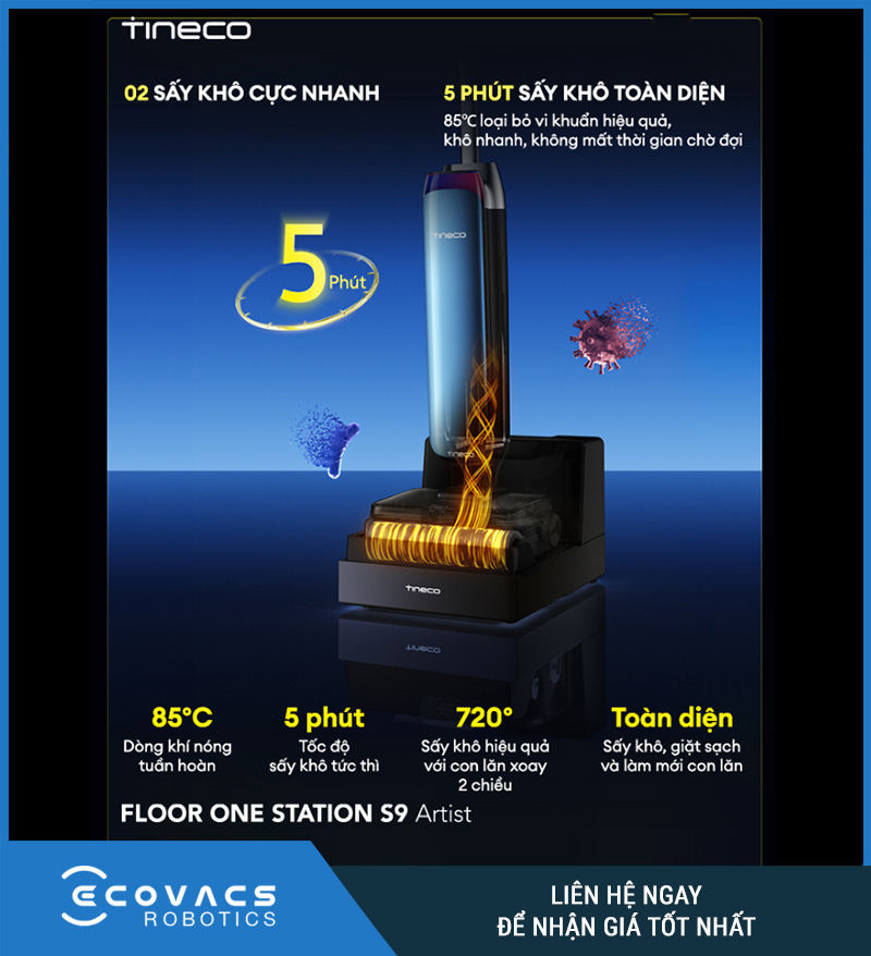 Tineco FLOOR ONE STATION S9 Artist được thiết kế để xử lý đồng thời bụi khô, tóc, rác nhỏ và vết bẩn ướt chỉ trong một lần đẩy máy. Trang sản phẩm nhấn mạnh thiết bị có thể hút bụi và lau nhà trong một bước, kết hợp với công nghệ MHCBS làm sạch con lăn liên tục để duy trì hiệu quả làm sạch ổn định hơn trong suốt quá trình vận hành.