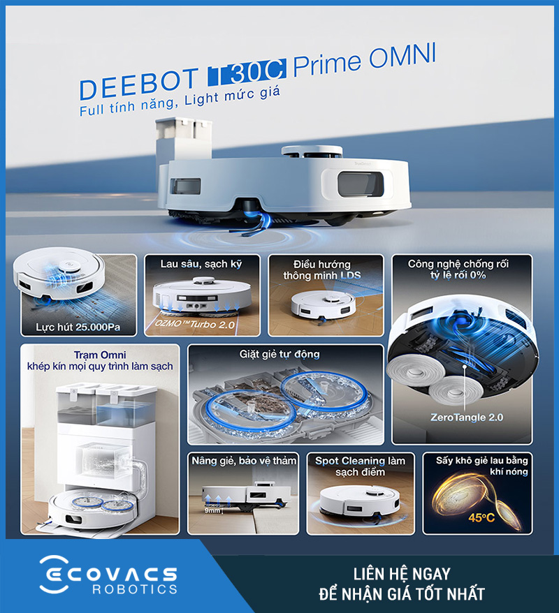 Ecovacs Deebot T30C Prime Omni là mẫu robot hút bụi lau nhà được phát triển để đáp ứng nhu cầu làm sạch toàn diện trong không gian sống hiện đại. Sản phẩm không chỉ mạnh ở phần hút bụi mà còn được hoàn thiện đồng đều ở nhiều khía cạnh quan trọng như chống rối tóc, lau sàn hiệu quả, tránh vật cản thông minh, tự động chăm sóc tại trạm sạc và điều khiển linh hoạt qua ứng dụng. Chính sự kết hợp này giúp robot không chỉ “chạy thay người”, mà thật sự giảm bớt gánh nặng việc nhà mỗi ngày.