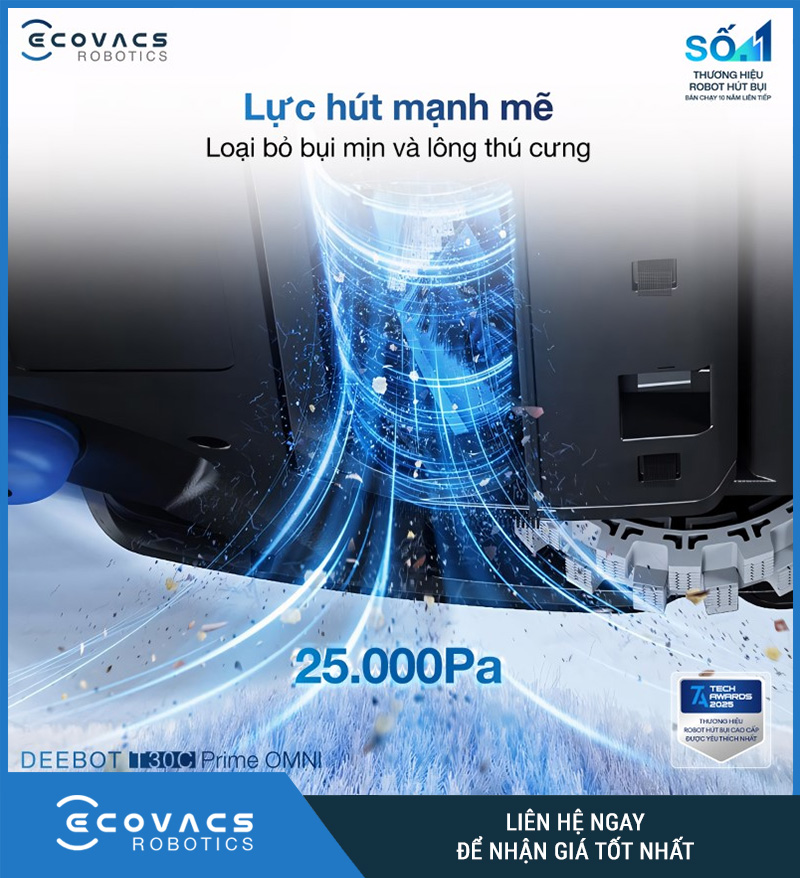 Một trong những điểm nổi bật nhất của Ecovacs Deebot T30C Prime Omni là lực hút tối đa 25.000Pa. Đây là mức lực hút rất cao, cho thấy robot không chỉ phù hợp với việc hút bụi thông thường mà còn đủ khả năng xử lý những loại rác khó hơn như tóc rụng, lông thú cưng, vụn thức ăn, bụi nằm sâu trong khe sàn hoặc bám trong thảm. Trên thực tế, lực hút mạnh là yếu tố tạo nên khác biệt rõ nhất giữa một robot mang tính hỗ trợ đơn thuần và một robot có thể mang lại hiệu quả làm sạch thật sự rõ rệt.