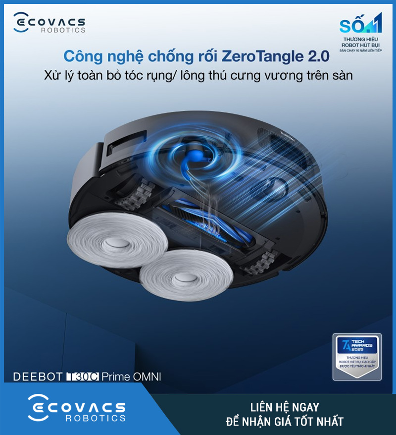 Một vấn đề rất phổ biến khi dùng robot hút bụi là tóc và lông thú quấn dày vào chổi, làm robot nhanh giảm hiệu suất và buộc người dùng phải tháo chổi ra vệ sinh bằng tay. Ecovacs trang bị cho T30C Prime Omni công nghệ ZeroTangle 2.0 để xử lý chính xác điểm khó chịu này. Công nghệ này được giới thiệu nhằm hỗ trợ hạn chế tình trạng tóc cuốn quanh cụm chổi trong quá trình hoạt động, từ đó giúp robot vận hành ổn định hơn.