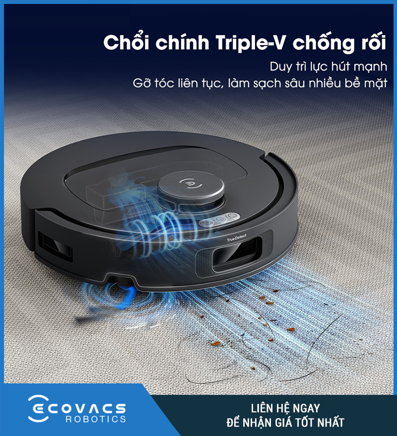 Chổi chính cấu trúc Triple-V là bộ phận đóng vai trò trung tâm trong hệ thống làm sạch của robot. Trang sản phẩm mô tả cấu trúc này gồm lông chổi chữ V hỗ trợ nâng bụi, chổi xoắn gom rác và lược chữ V giúp tách tóc, từ đó tạo ra một chu trình làm sạch đồng bộ hơn từ lúc bụi được kéo khỏi mặt sàn cho đến khi được đưa vào họng hút.