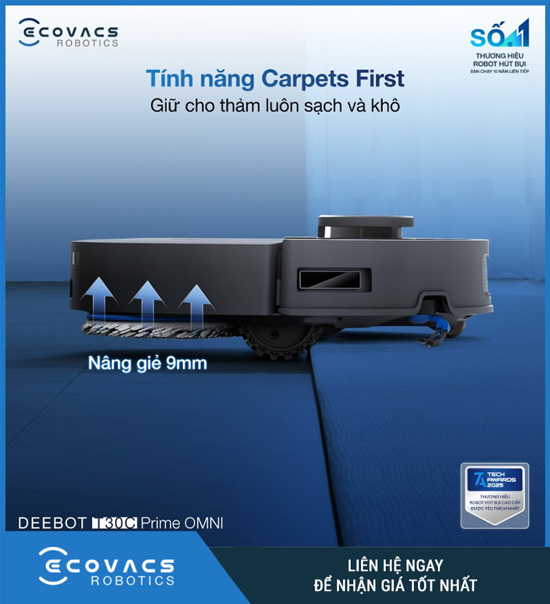 Một trong những tính năng rất thực tế trên Ecovacs Deebot T30C Prime Omni là khả năng tự động nâng giẻ lau lên 9mm khi gặp thảm. Đây là tính năng đặc biệt quan trọng với những gia đình sử dụng kết hợp sàn gạch, sàn gỗ và thảm trong cùng một không gian. Khi robot đang ở chế độ lau mà phát hiện thảm, giẻ sẽ được nâng lên để tránh tiếp xúc trực tiếp với bề mặt thảm.