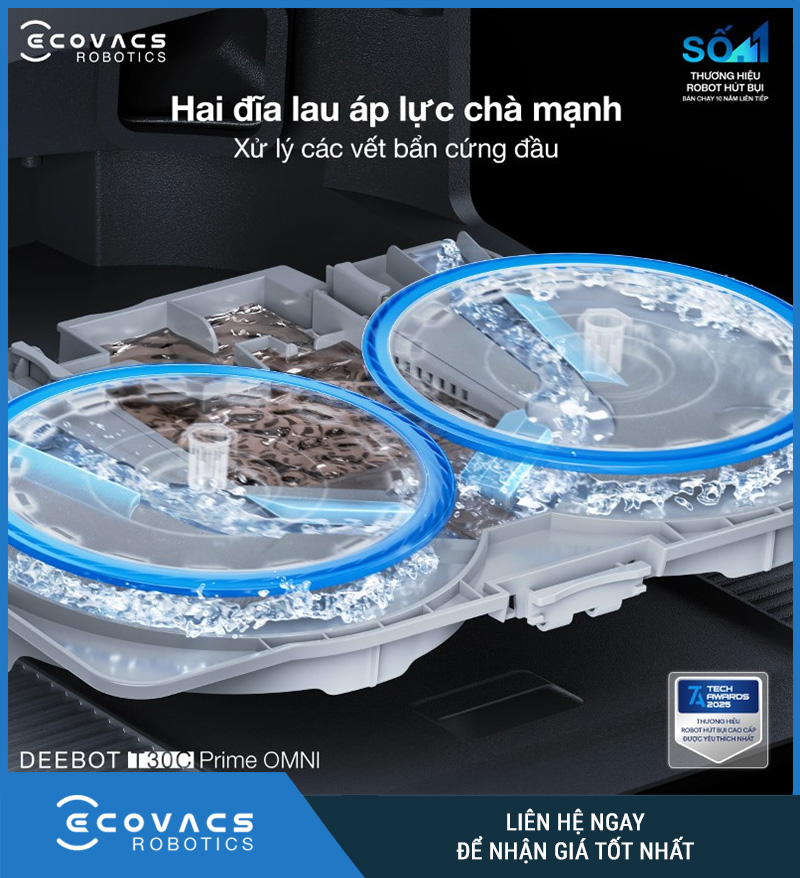 Không chỉ mạnh ở khả năng hút, T30C Prime Omni còn được nâng cấp đáng kể ở phần lau với công nghệ lau xoay OZMO Turbo 2.0. Theo trang sản phẩm, hệ thống này sử dụng hai đĩa lau xoay áp lực cao để tăng khả năng chà rửa, nhờ đó xử lý tốt hơn các vết bẩn bám trên mặt sàn so với kiểu lau kéo truyền thống.