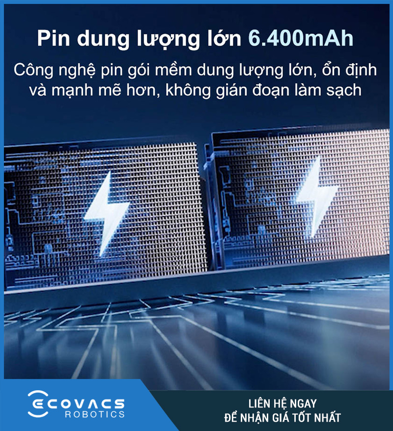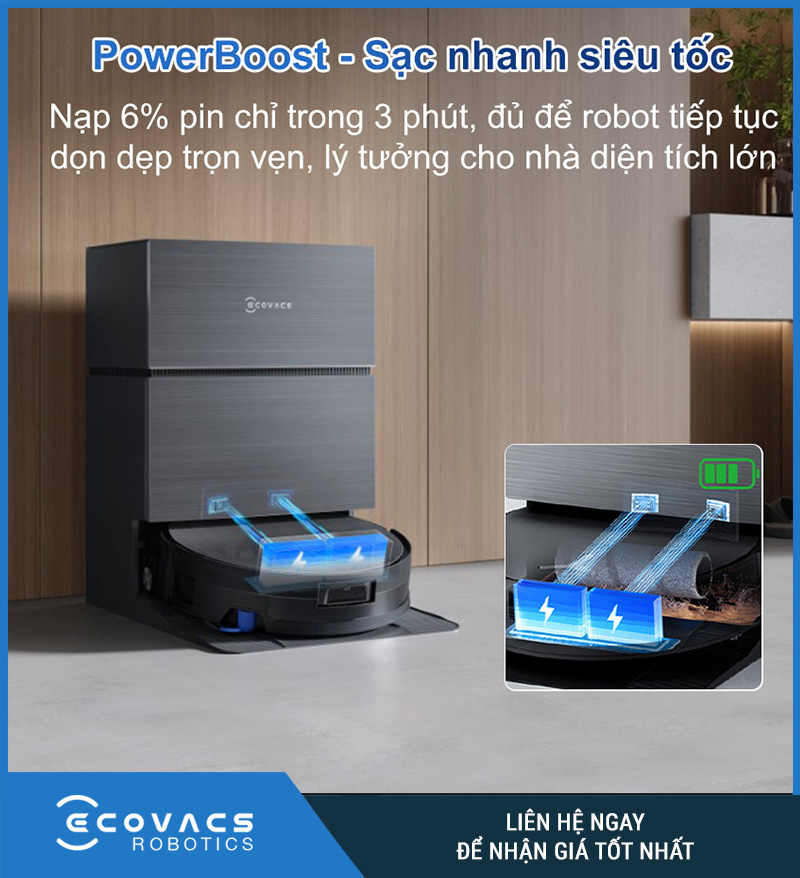 Một trong những điểm khác biệt lớn của Ecovacs Deebot X11 Omni 2026 chính là thời lượng pin vượt trội. Robot được trang bị pin dung lượng 6.400mAh dạng mềm thế hệ mới, hỗ trợ công nghệ PowerBoost Instant Ultra-Charge cho khả năng sạc siêu nhanh.