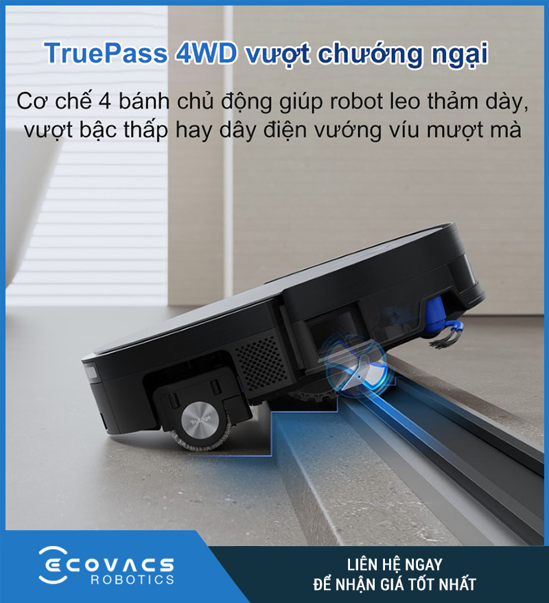 Không chỉ mạnh về pin, Ecovacs Deebot X11 Omni 2026 còn gây ấn tượng ở khả năng vượt địa hình. Máy được trang bị hệ thống TruePass bốn bánh định hướng, giúp robot dễ dàng vượt qua chướng ngại vật cao đến 24mm – tức là có thể leo qua thảm dày, sàn gồ ghề hay bậc cửa thấp mà không gặp khó khăn.