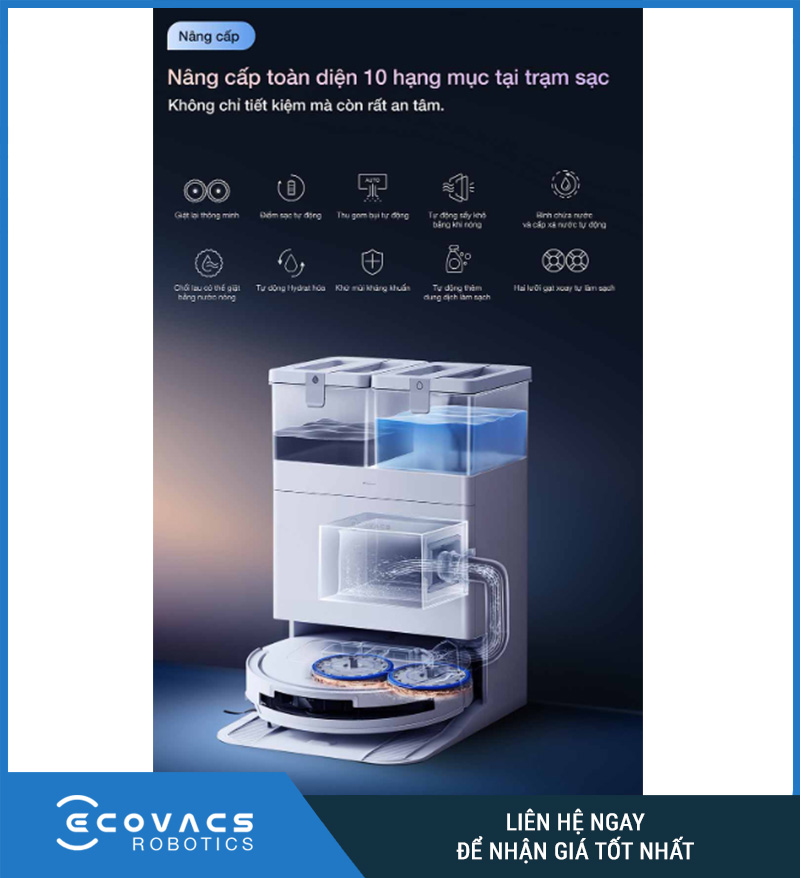 Trạm OMNI trên Deebot X1 Omni không chỉ là dock sạc – mà là một hệ thống “tự động hóa toàn diện” giúp robot hút bụi vừa đổ rác, giặt – sấy giẻ lau và tự nạp nước. Đây là một trong những điểm khác biệt giúp Deebot X1 trở thành robot hút lau cao cấp hàng đầu hiện nay.